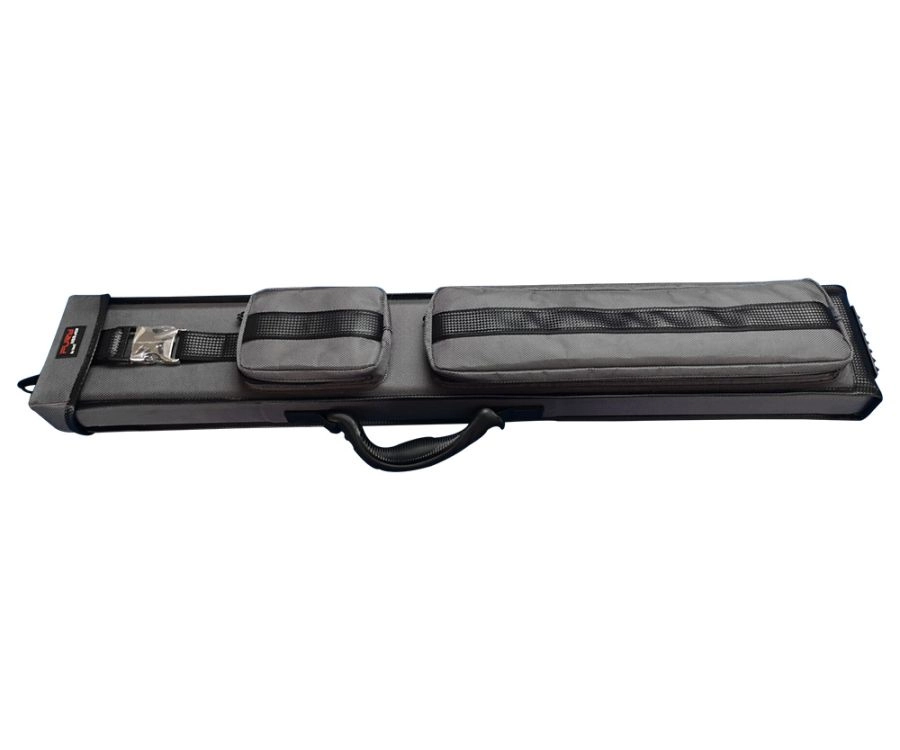 Fury has released a new line of hard cue cases in a variety of colors! This case keeps it simple and is made of grey vinyl and black trim. It safely packs 3 butts and 5 shafts. Fury could well be a trend setter with their design that opens at the top with a metal buckle. At a total length of 33″, tote around the case by it’s side carrying handle or shoulder strap! Consider storing the butt of your jump cue in the larger pocket that’s a length of 16″ and your tip tools in the smaller pocket above.